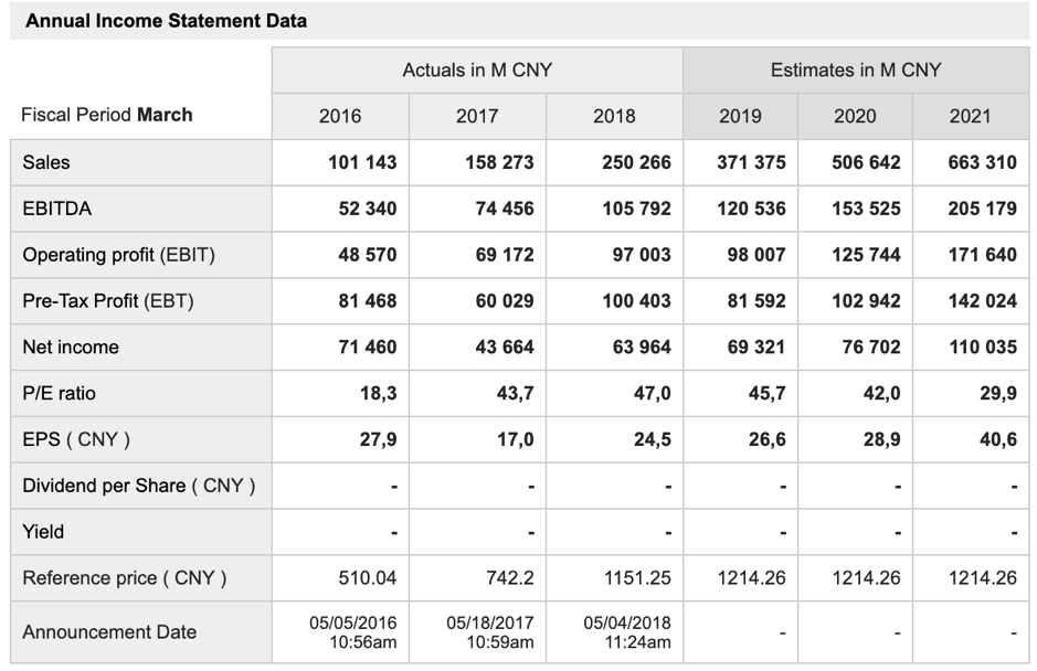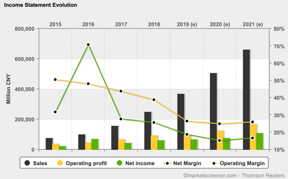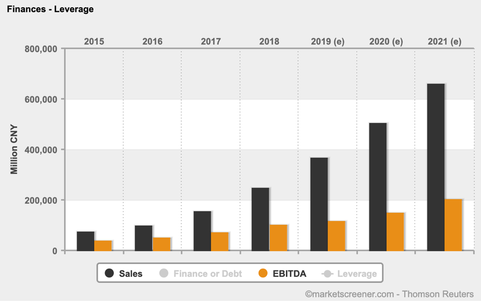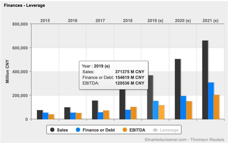 受全球贸易争端风险和中国经济增长放缓的影响,市场预测阿里巴巴的销售数额虽然会从2502亿人民币上升到3713亿人民币,但是EBITDA的增速有所放缓,EBT会下降。