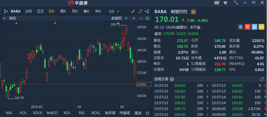 与此同时,受全球贸易争端风险和中国经济增长放缓的影响,阿里巴巴在一月份表示收入增速为2016年初以来的最低水平。虽然该公司首席执行官张勇说“宏观经济放缓可能会引起市场担忧,但我们从阿里巴巴的平台上看到,中国的消费增长依然强劲。”但是该公司的股价在一间年之间从最高位约200美金跌到了目前的170美金。