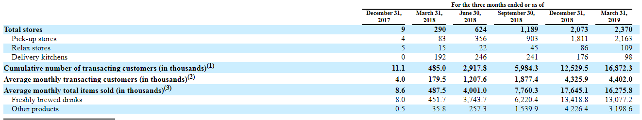 公司为国内领先的咖啡服务供应商,采取新零售模式主要供应鲜磨咖啡。17年10月在北京开启第一家咖啡门店,不到两年规模飞速增长。2018年底公司拥有门店数达2073间,2018年一年新开2064间门店,卖出咖啡数为9000万杯。截至2019年3月31日,瑞幸咖啡共计拥有2370家自有门店,累计交易客户超过1680万。