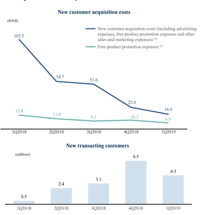 另外,规模成长及推广带来服务成本及获客成本的下滑,每杯咖啡成本从2018年Q1的28元降至近10元,获取新客成本从103.5元降低到16.9元,促销费用从15.8元降到了6.9元。
