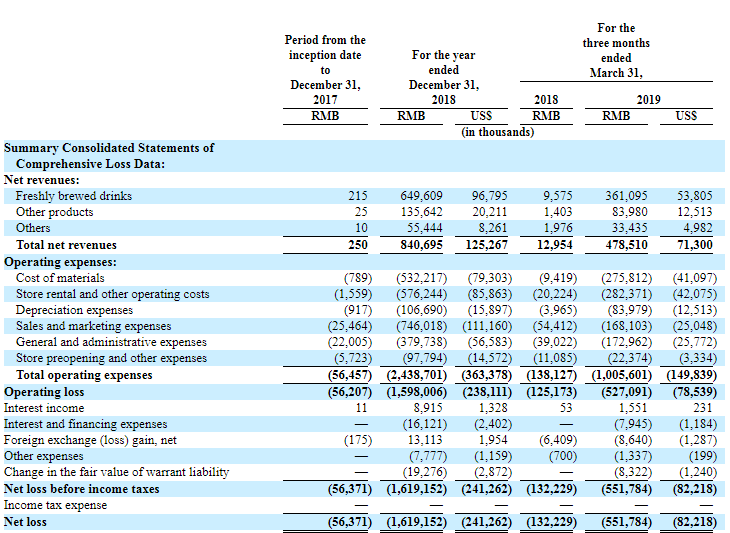 规模快速扩张的背后是收入的大幅增长,但持续烧钱带来亏损的持续扩大。2019年Q1总净营收为4.785亿元人民币,相比之下2018年Q1总净营收只有129.5万元人民币;2019年Q1净亏损5.518亿元人民币,相比之下上年同期亏损只有1.32亿人民币,2018全年总净营收为8.407亿元人民币,净亏损16.19亿元人民币。