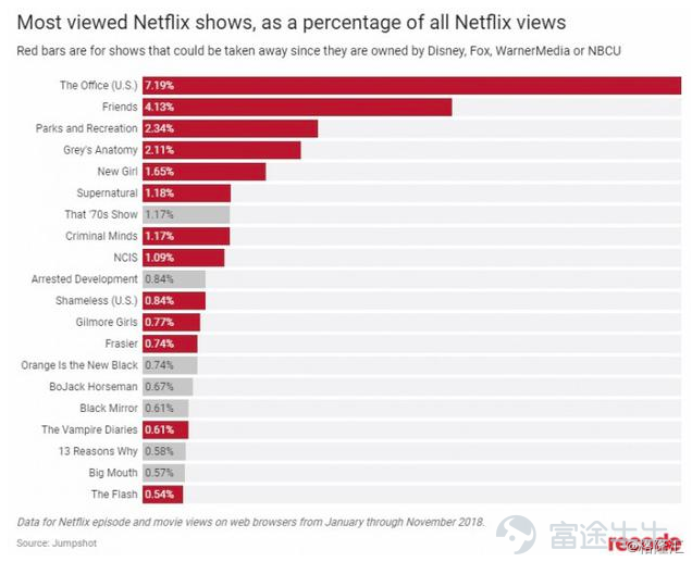 在这个模式中,内容显然是核心。在网上广泛流传一张图,说奈飞上观看次数最多的内容中有绝大多数是别家的版权内容,存在不定期被收回的风险,让人不自觉的为奈飞握紧了拳头。