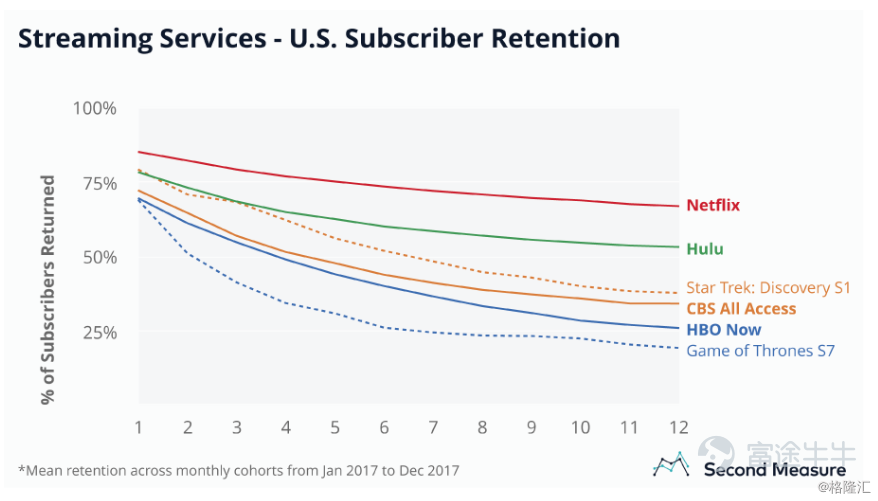 先看一张图,Second Measure统计的2017年各大平台用户平均留存率,其中奈飞最高,高达75%上下,次之是Hulu。值得一提的是,大热的《权利的游戏》(这里是统计的第七季期间的用户数据)用户留存率到年底仅在25%左右。