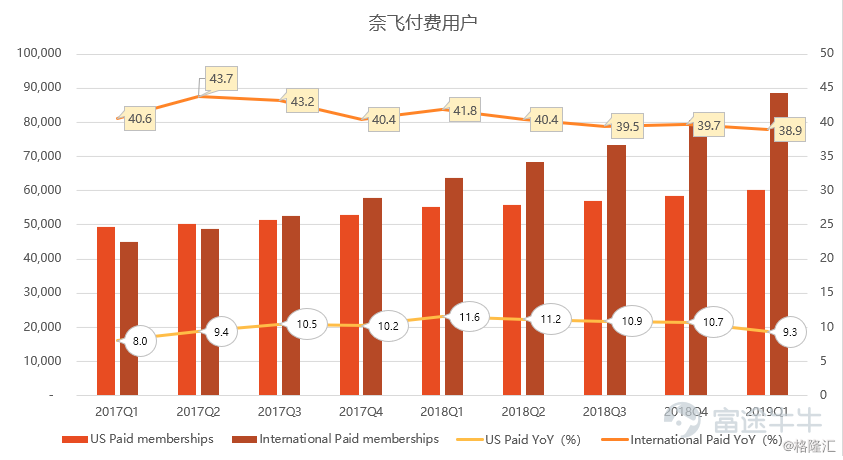 因为基数小,剪线一族的可挖掘空间年均在10%+,流媒体行业用户基数较大,增速很低了,这对整个行业而言其实是一个警钟,美国市场未来寻增长不容易。但19Q1奈飞美国用户为60.229 million,渗透率在35%左右,还有较大上升空间。