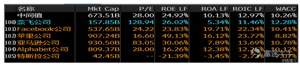 选了几项重点的参考指标,供大家判断。和FAANG其他几位科技公司+特斯拉相比,奈飞的PE也是很高,超过了亚马逊,ROA和ROIC表现较为落后,值得注意的是WACC高于ROIC,且高于其他公司。