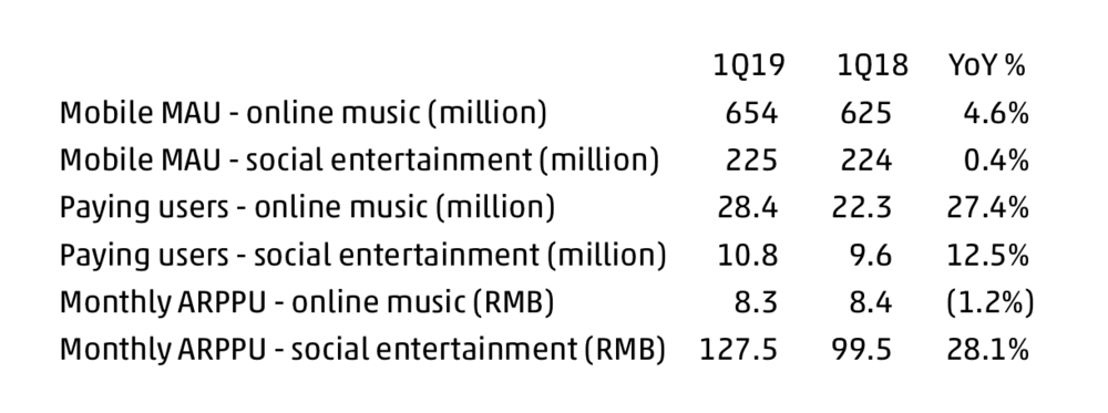在线音乐服务的月度ARPPU(平均每付费用户收入)同比下降1.2%至8.3元;