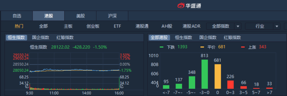 昨日恒指早盘跳空低开2.1%,之后逐步反弹,收盘时跌428.22点,跌幅1.5%,报28122.02点,全日成交额1245.37亿。国企指数跌1.53%,红筹指数跌1.79%。
