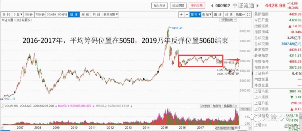 股市分析方式有很多,股市的行情也是由众多合力构建成的。分析点有很多,我就讲其中一个点:2016-2018年年初,市场流通股市场筹码交易基本集中在5050附近,而2019年这一波反弹,到5060点结束。