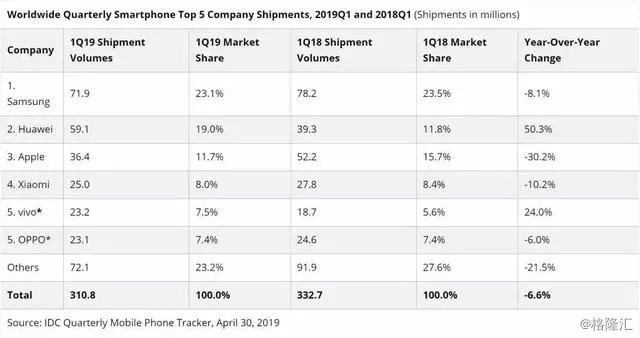 其中,在IDC最新的2019年Q1全球手机销量报告中,华为以5910万部出货量站稳了世界第二大手机供应商的位子,而小米、OPPO和vivo则分别位列第四名和并列第五名。