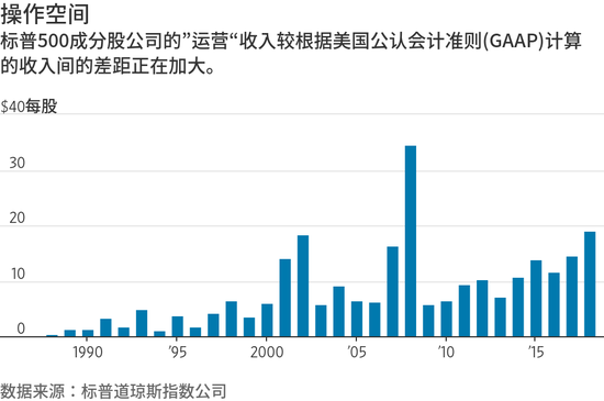 企业普遍采用能够美化财务报表数字的指标,如果使用标准会计方法,其报表就会显得逊色一些。标普道琼斯指数公司(S&P Dow Jones Indices)的高级指数分析师Howard Silverblatt称,标普500指数成分股公司使用调整后利润指标公布的2018年每股收益较标准指标高出19美元。