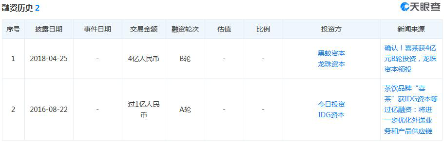 记者搜索天眼查信息显示,2016年8月,喜茶完成IDG资本、今日投资A轮融资,金额超过1亿元,该轮融资主要用于优化外送业务和产品供应链;2018年4月,喜茶又获4亿元B轮融资,由美团点评旗下龙珠资本与黑蚁资本投资。
