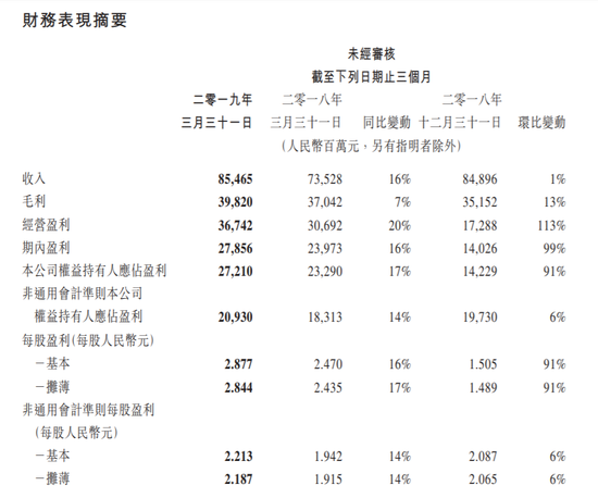 二零一九年第一季收入同比增长16%,主要是受商业支付服务及其他金融科技服务,社交广告及数字内容服务所推动。