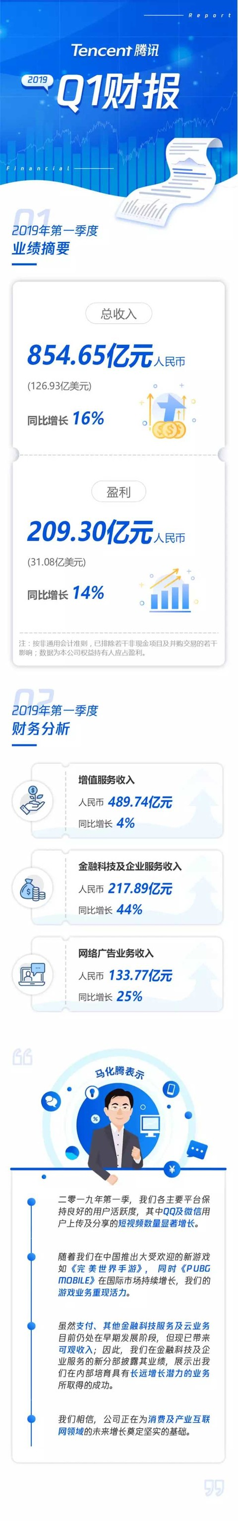 于二零一九年第一季,微信及微信的合并月活跃账户数达11.12亿,同比增长6.9%。在第一季,QQ的智能终端月活跃账户数同比略有增长至逾7亿。其中,年轻用户在QQ平台的活跃度提升,其月活跃账户数同比录得双位数增长。