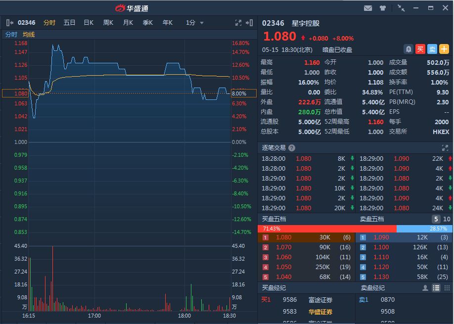 星宇控股暗盘收报1.08港元,较发行价1港元涨8%,每手赚160港元,成交额556万港元,总市值为5.4亿港元。