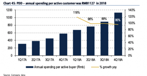 美林分析预测:2019至2021年期间,拼多多年活跃买家平均消费额将增加至少两倍(人年均3258元),整体GMV将于2年后达到1.864万亿元,年复合增长率为58%。