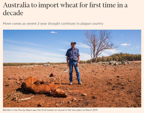 上个月,澳大利亚气象局(Bureau of meteorological)报告称,作为全球最大的小麦出口国之一,澳大利亚在2018-2019年经历了有记录以来最热的夏季。墨累达令盆地(Murray Darling Basin)是一个富饶的地区,面积相当于德国和法国,为澳大利亚提供了三分之一的食物。在截至2019年3月底的两年里,墨累达令盆地的降雨量是有记录以来第三低的,仅次于1901-1903年和1918-1920年。