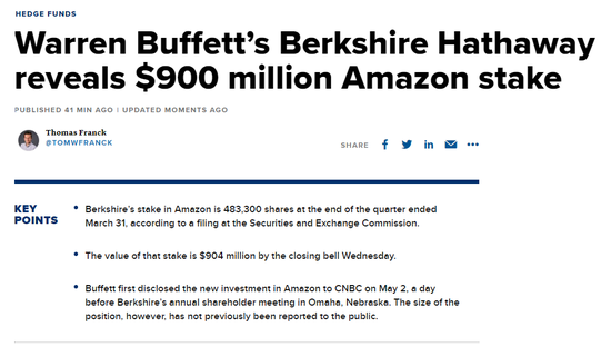 5月2日,在伯克希尔哈撒韦公司奥马哈年度股东大会前一天,巴菲特首次透露了对亚马逊的新投资。不过,持仓规模并未向公众公布。