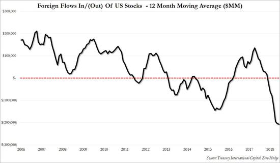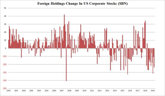 截至3月的12个月内,海外投资者的美股持仓流出资金合计2070亿美元,也创造了海外投资者一年期抛售规模的最高纪录。