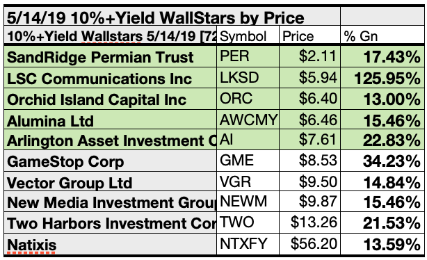 $5k invested 5/14/19 in the lowest-priced five 10%+ top-yield ten dividend stocks showed 32.3% more projected net-gain than from $5k in all ten, per Broker targets. The low-price smaller Top Dogs dominated the May 10%+yield pack.