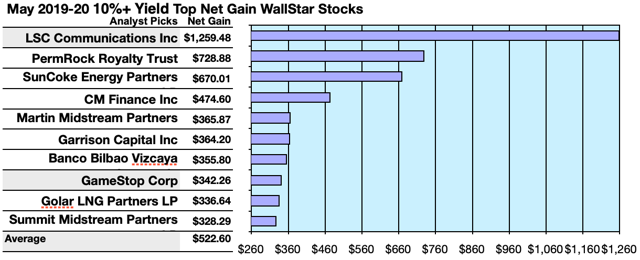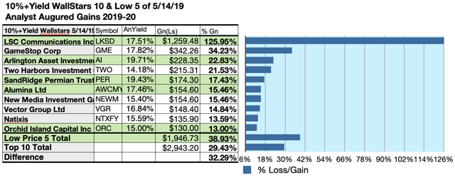 Two of ten top 10%+Yield WallStars were among the top ten gainers for the coming year (based on analyst 1-year targets). So, this forecast for 10%+ Yields, as graded by Wall St. Brokers, was 40% accurate.