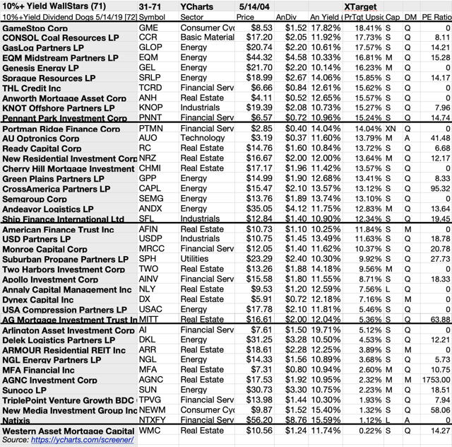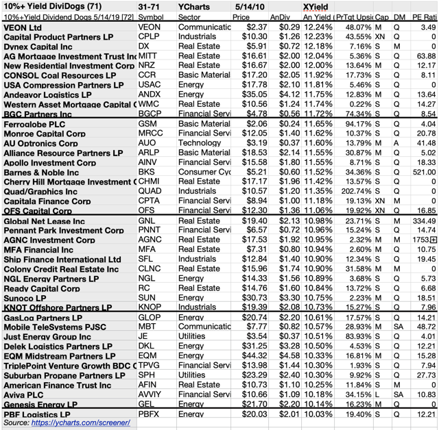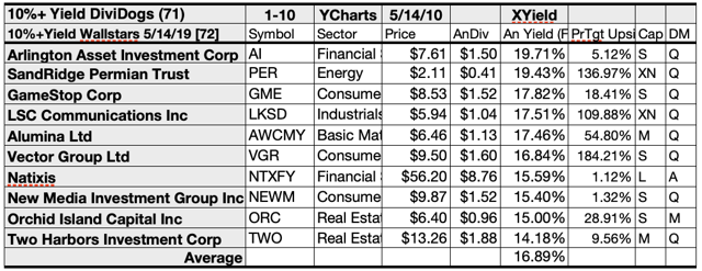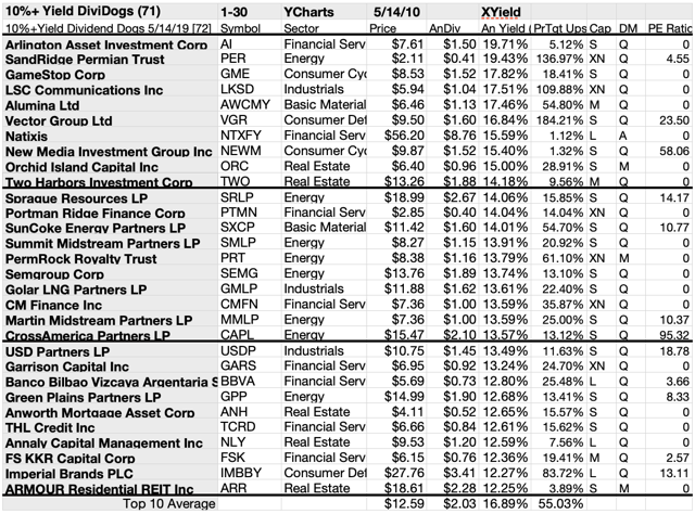 Ten top 10%+ Yield Top Dogs were culled by yield for this May update. Yield (dividend/price) results verified by Yahoo Finance did the ranking.