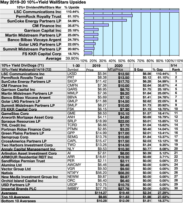These Top Dogs all show positive broker target price upsides. 71 stocks displayed 10%+ forward yield, $2.00+ prices, and $100M+ market caps 5/14/19. Yields above 12.25% winnowed the list to T.