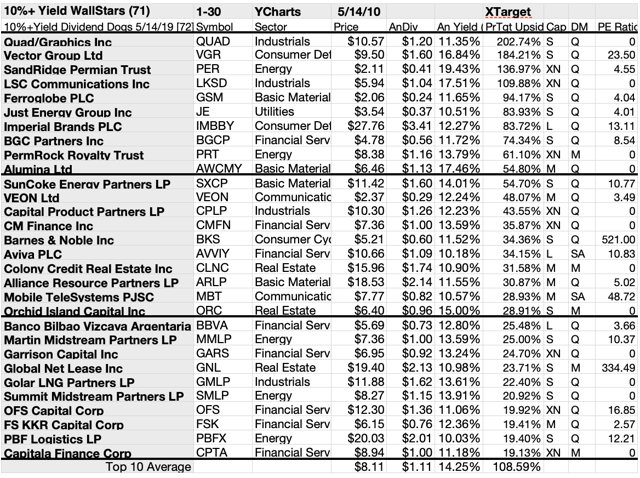 Top ten 10%+Yield Top Dogs selected 5/14/19 by yield represented seven of eleven Morningstar sectors.