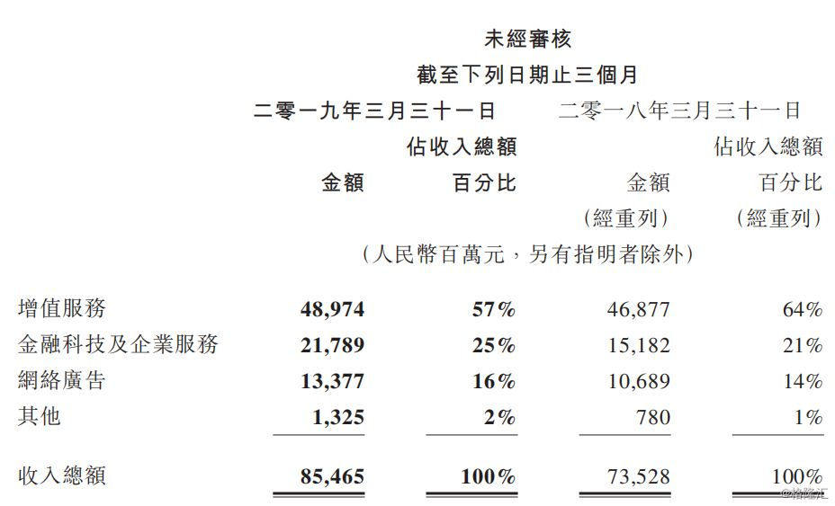 而金融科技及企业服务业务则同比大涨44%至217.89亿元,主要受商业支付、其他金融科技服务(例如小额贷款)及云业务所推动。值得注意的是,金融科技及企业服务的营收在2019年一季度中首次超过了手游业务212亿元的营收。