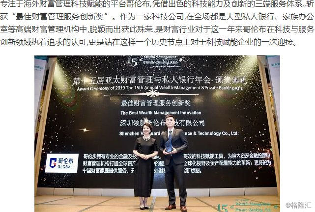 《哥伦布斩获“第十五届亚太财富管理与私人银行年会·最佳财富管理服务创新”大奖》