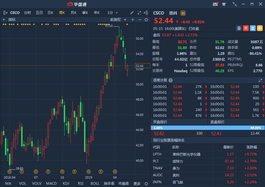 思科(CSCO)今早发布了2019财年第三财季财报,季度营收和调整后盈利均超出分析师预期,同时下季盈利展望符合预期,受业绩刺激盘后股价涨近3%。