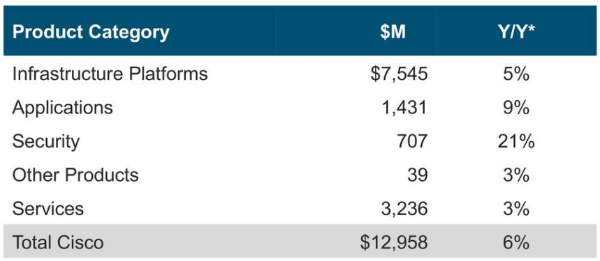 具体再细分,产品项下前两大业务:基础设施和平台产品、应用产品营收分别同比增长5%,及9%,增速相当可观;此外,安全产品季度贡献营收为7.7亿美元,同比大增21%,为整体产品增速的3倍,体现了公司安全领域投资的成果,去年斥资23.5亿美元收购互联网安全公司Duo Security。安全领域为公司在交换机和路由器等传统硬件业务外的转型重点方向,其收入占总体产品营收的比例继续提升。