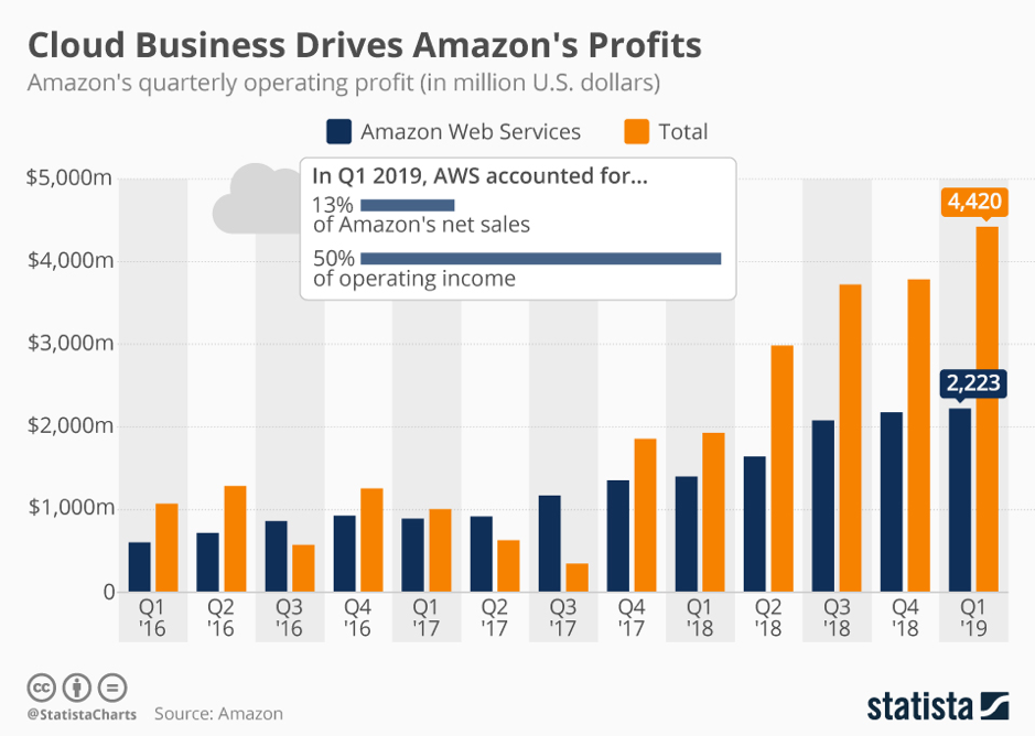 该公司在云服务上做得非常出色。云服务利润占了总数的半数。亚马逊网络服务可能仍将是B2C云服务的领导者,而微软会在企业方面占主导。其在企业方面取得了一些重要进展,例如与大众汽车、福特等汽车企业合作。