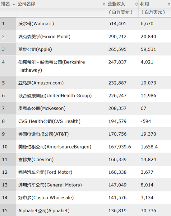 在今年的榜单上,沃尔玛连续第七年蝉联榜首,石油天然气巨头埃克森美孚位居第二,苹果公司重回第三位,它仍是美国500强中最赚钱的公司,盈利高达595.31亿美元,相比去年大幅上涨了23%。亚马逊继续保持强劲增长,首次进入前五。