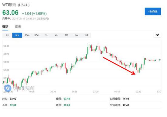 WTI 6月原油期货收涨0.85美元,涨幅1.37%,报62.87美元/桶;盘中最高触及63.48美元的两周新高,是5月13日以来首次重回63美元整数位,日内最大涨幅2.4%。