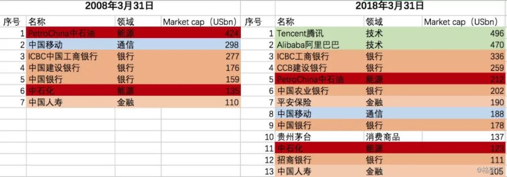 相比于美国,中国千亿市值公司的变迁更为稳定,但这并不意味着没有故事。中国千亿市值公司的出现也就是近30年的事情,起步晚。2008年3月才7家,总市值达到15790亿美元,到2018年上升到13家,市值几近翻倍达到30070亿美元。