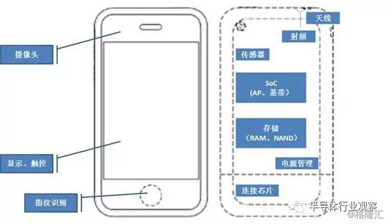 手机里用到的芯片很多,主要部分可分为:处理器(基带+AP),存储器(DRAM和NAND Flash),电源管理,以及RF前端芯片。另外,还有Wi-Fi和生物识别芯片等。