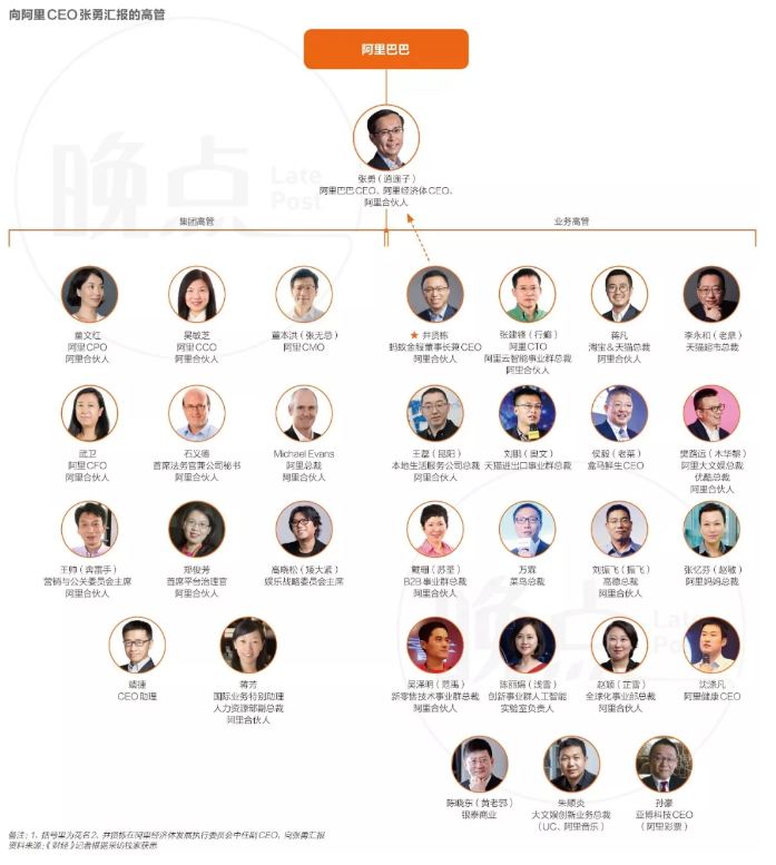 具体业务层面,有近20人向张勇汇报,涵盖了阿里每一个重要业务板块,包括:淘宝&天猫总裁蒋凡、天猫超市总裁李永和(老鼎)、天猫进出口事业群总裁刘鹏(奥文)、盒马鲜生CEO侯毅(老菜)、本地生活服务公司总裁王磊(昆阳)、CTO&阿里云智能事业群总裁张建锋(行癫)、阿里大文娱总裁&优酷总裁樊路远(木华黎)、大文娱创新业务总裁朱顺炎、B2B事业群总裁戴珊(苏荃)、菜鸟总裁万霖、高德总裁刘振飞(振飞)、阿里妈妈总裁张忆芬(赵敏)、新零售技术事业群总裁吴泽明(范禹)、创新事业群人工智能实验室负责人陈丽娟(浅雪)、全球化事业部总裁赵颖(芷雪)、阿里健康CEO沈涤凡、银泰商业CEO陈晓东(黄老邪)、亚博科技CEO孙豪等人。
