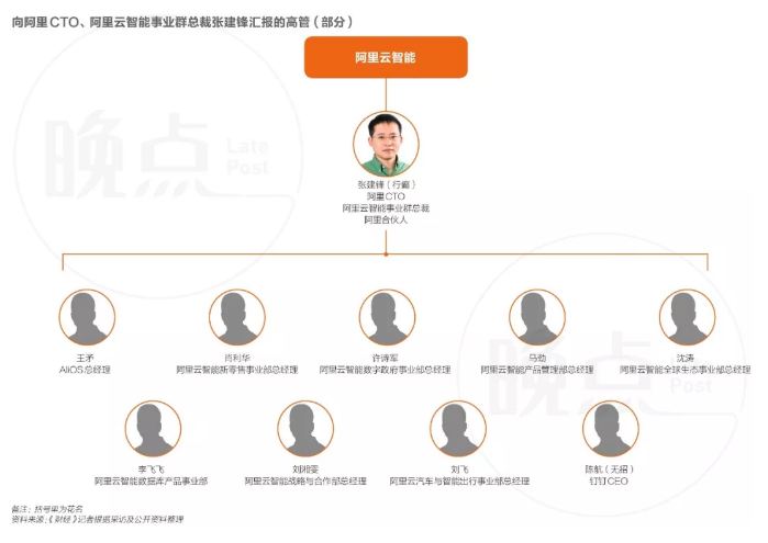 据《财经》记者不完全统计,目前直接向张建锋汇报的管理层包括AliOS总经理王矛、阿里云智能新零售事业部总经理肖利华、阿里云智能数字政府事业部总经理许诗军、阿里云智能产品管理部总经理马劲、阿里云智能全球生态事业部总经理沈涛、阿里云智能数据库产品事业部李飞飞、阿里云智能战略与合作部总经理刘湘雯、阿里云汽车与智能出行事业部总经理刘飞等人,钉钉CEO陈航(无招)目前也直接向张建锋汇报。