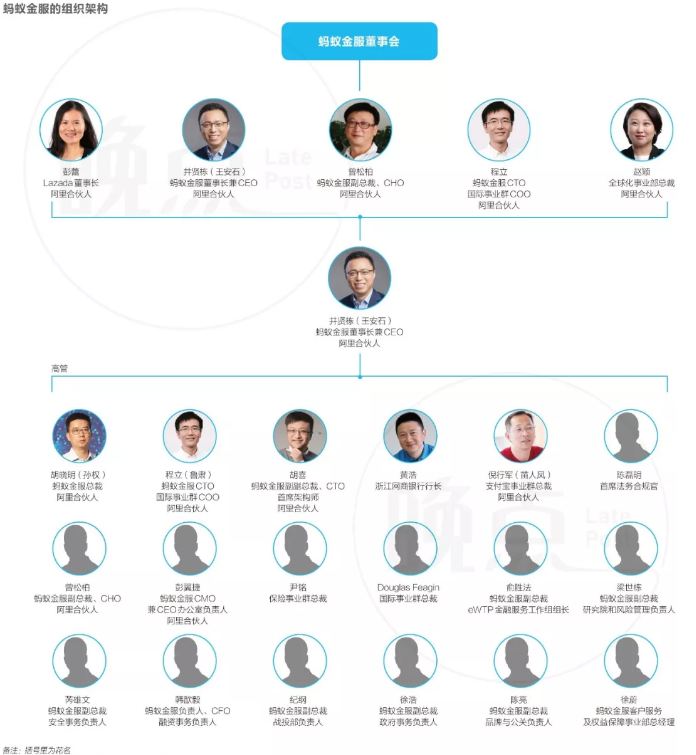 蚂蚁金服董事会目前共有5人,包括阿里元老&现任Lazada董事长彭蕾、蚂蚁金服董事长兼CEO井贤栋(王安石)、蚂蚁金服副总裁&CHO曾松柏、蚂蚁金服CTO&国际事业群COO程立、阿里全球化事业部总裁赵颖。