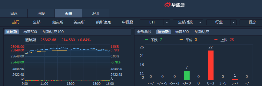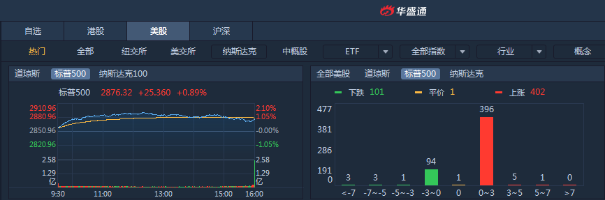周四,美股受亮眼公司财报和经济数据提振,三大指数均收涨,标普500涨幅0.89%,道指涨幅0.84%,纳指涨幅0.97%。