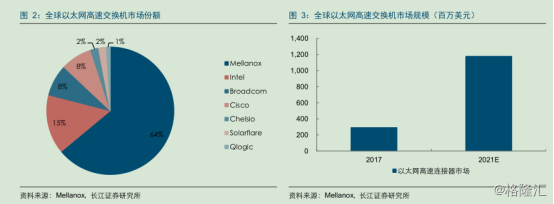 根据长江证券研究报告显示,Mellanox 是全球领先的数据中心和存储系统高性能互联解决方案供应商。公司提供网络和多核处理器、网络适配器、交换机、电缆、软件和芯片等多种高性能解决方案,可广泛用于高性能计算、企业数据中心、Web2.0 等领域。Mellanox在以太网高速交换机和 InfiniBand 两大领域处于领先,其中Ethernet 市场份额高达 64%,将受益行业 42%的复合增长速度。