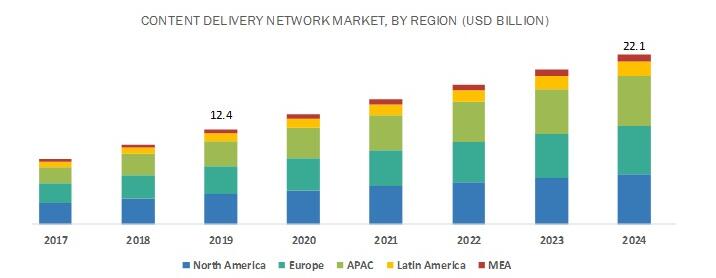 根据Markets and Markets 数据报告,2019年全球所有内容交付网络市场规模达124亿美元,预计到2024年将增长至221亿美元,年复合增长率12.3%,其中媒体和娱乐业务将在较长一段时间内保持最大业务份额。