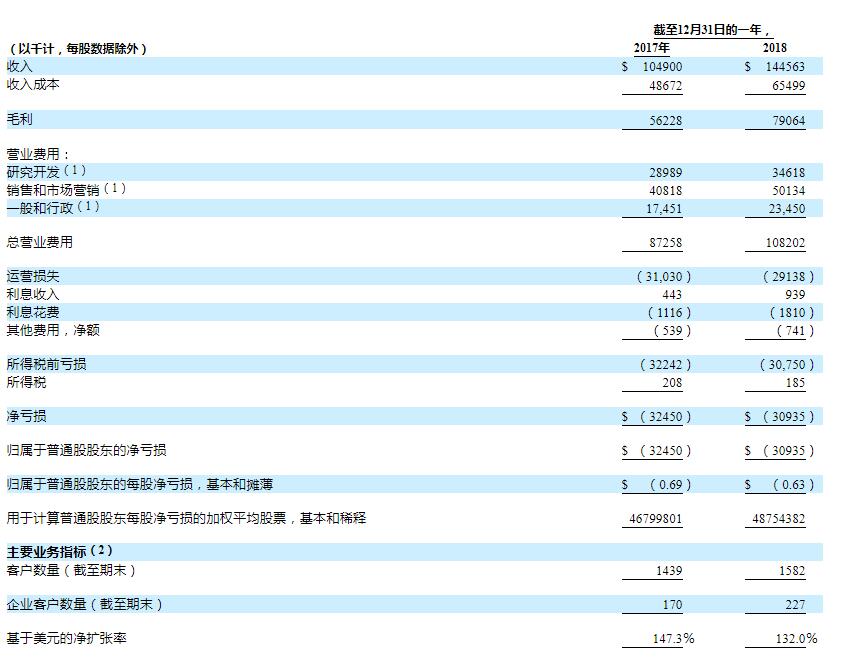 截至2017营业收入为1.049亿美元,2018年收入达1.446亿美元,增长约为38%。净亏损为3250万美元和3090万美元,亏损呈收窄趋势。