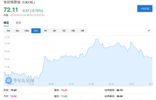 布伦特油价下跌0.70%,至72.11美元, 但本周累涨2.3%,周四收盘价触及72.62美元,创5月来最高。