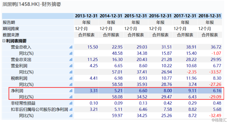 不过即便没有做空机构怀疑利润的造假,周黑鸭的发展瓶颈也在业绩可以看得出来,2018年全年营收36.72亿港元,同比下降1.60%,净利润6.16亿,同比下降29.09%。