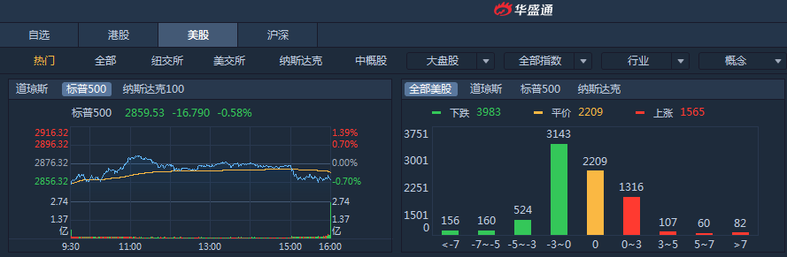 周五,受特朗普出口制裁名单影响,科技股拖累行情,美股三大股指普跌,标普500跌幅0.58%,报2859.53点,纳斯达克跌幅1.04%,报7816.285点,道琼斯工业指数跌幅0.38%,报25764点。
