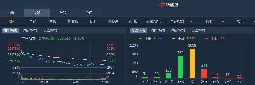 恒指早盘高开0.54%,盘初受权重股拖累下行,临近午间收盘小盘反弹,午后悲观情绪使得恒指再度走低跌破年线,跌328.61点或1.16%,报27946.46点,全日成交额达1024.34亿。国企指数跌1.14%,报10688.75点,红筹指数跌1.07%,报4345.47点。