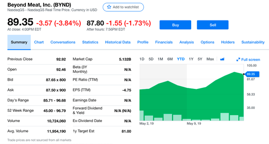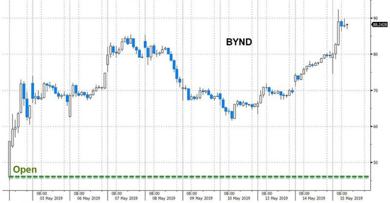 5月2日上市首日,Beyond Meat股价即涨超163%,不到半个月的时间,即便在美股市场状况总体低迷的情况下,该公司依然涨势汹涌,涨幅距离25美元/股的上市发行价已经超过250%。