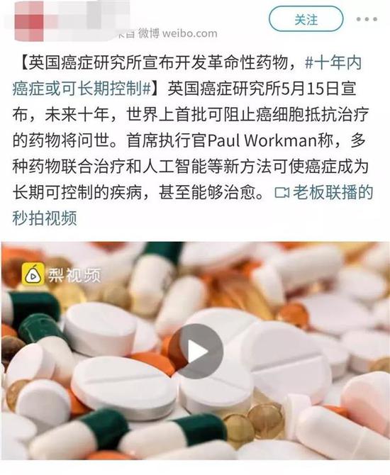 而这两天,我们在癌症方面似乎看到了新的希望:英国癌症研究所5月15日宣布,未来10年,世界上首批可阻止癌细胞抵抗治疗的药物将问世。其首席执行官称,多种药物联合治疗和人工智能等新方法可使癌症成为长期可控制的疾病,甚至能够治愈!