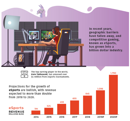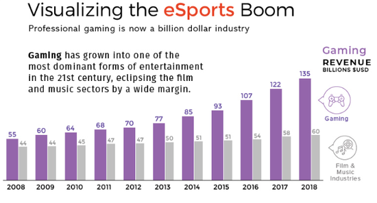 Desjardins指出,现在说电子游戏已经是现代人主流的消遣方式怕是不会再有太多争议了。目前全球电子游戏行业每年能够产生1350亿美元的收入,几乎是电影和音乐行业的一倍。而随着数以亿计的玩家渴望看到顶尖游戏选手的表现,电竞比赛一票难求、高额赞助费以及数额惊人的奖金池也应运而生。